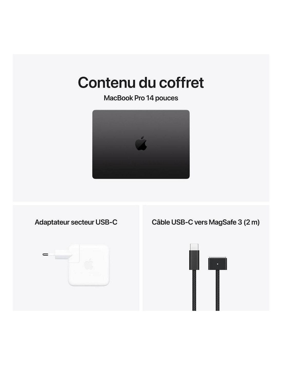 Modèle : MCX04FN/A - Puce : Apple M4 CPU 10 cœurs (GPU 10 cœurs) - RAM : 24 Go - Stockage : 1 To SSD - Écran : 14" LED Liquid Retina XDR - Connectivité : Wi-Fi 6E/Bluetooth - Webcam - Système d'exploitation : macOS Sequoia - Couleur : Noir sidéral